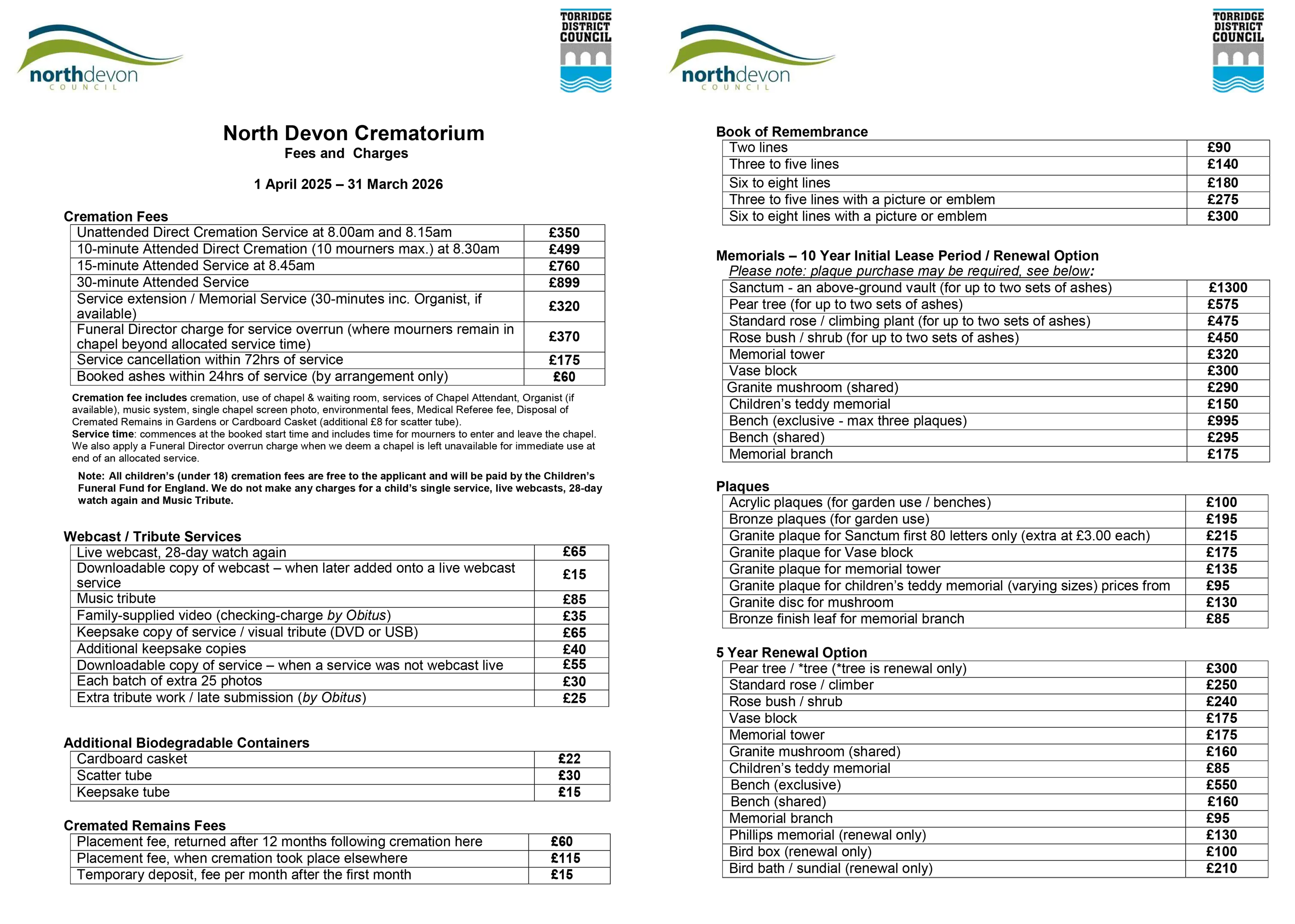 • Torridge Cemetery Internment fee for local residents (single grave).